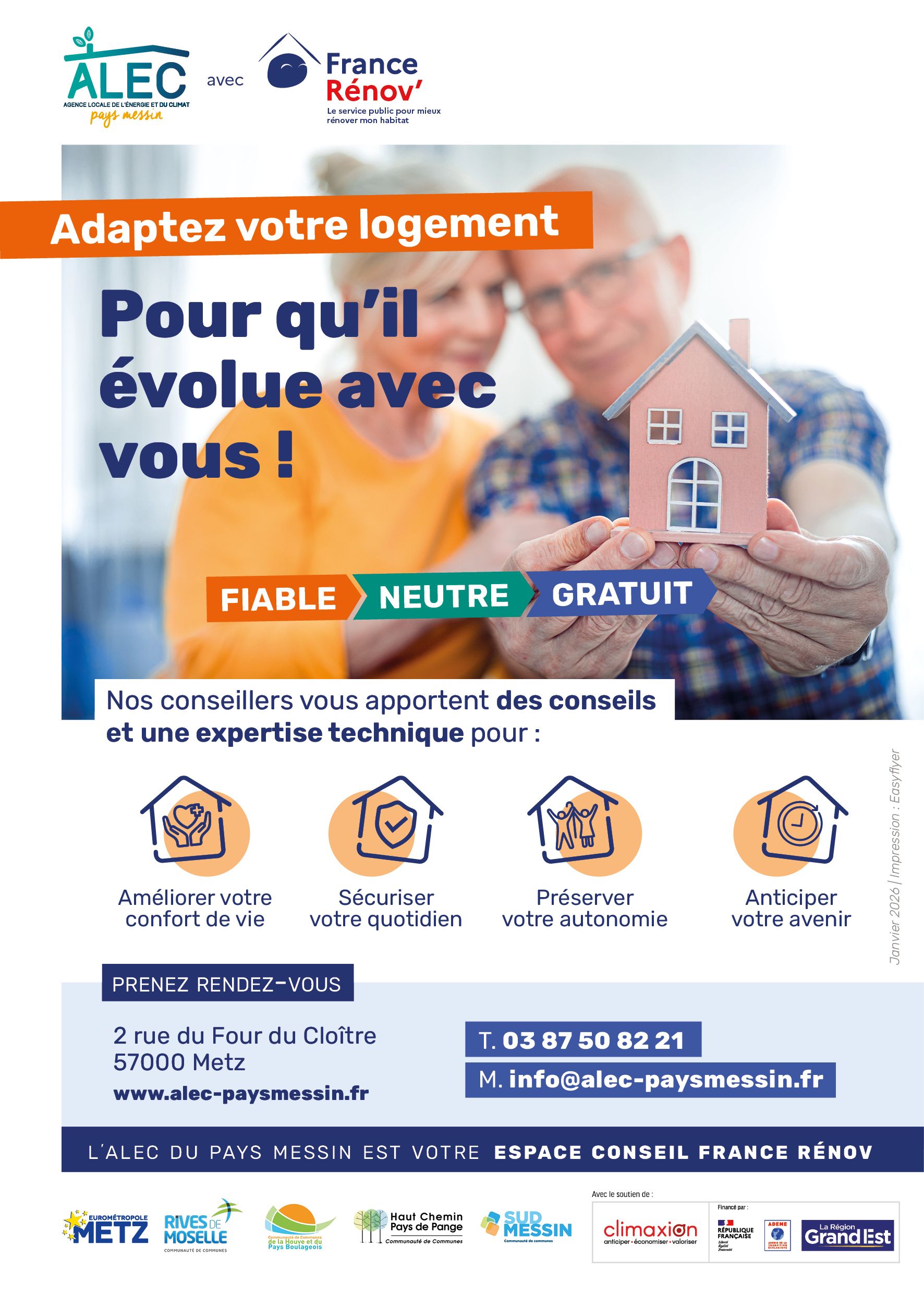 Pour cela, les conseillers France Rénov’ de l’Agence Locale de l’Energie et du Climat (ALEC) du Pays Messin vous apportent des conseils et une expertise technique sur votre projet de rénovation énergétique ou d’adaptation de l’habitat face à une perte d’autonomie.