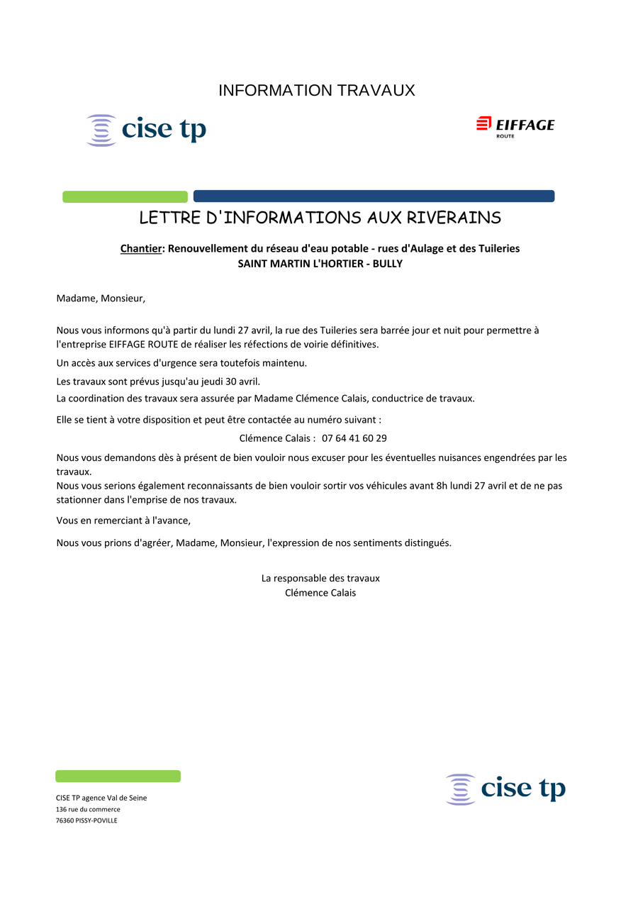 Nous vous informons que la rue des Tuileries sera fermée dans les deux sens du Lundi 27 Avril au Jeudi 30 Avril pour la remise en état de sa chaussée.