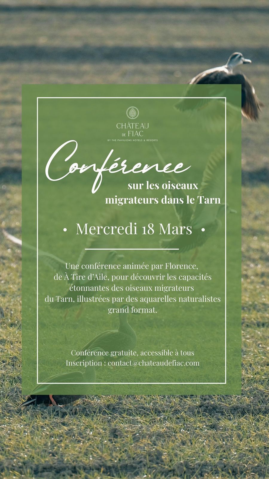 Pas d'apéro-conférence ce mois-ci, mais une conférence gratuite au Château de Fiac sur les oiseaux ! Rendez-vous à 19h.