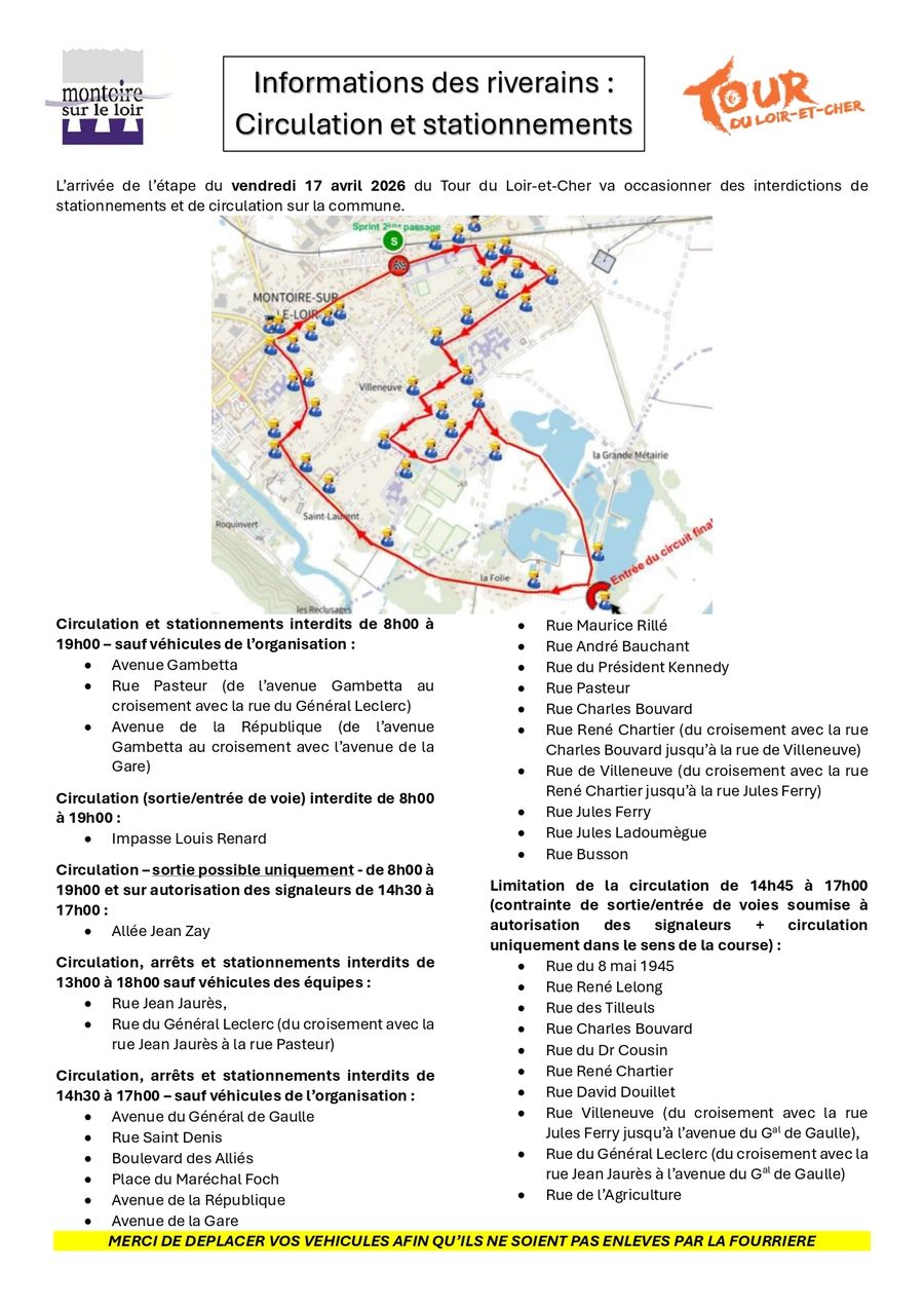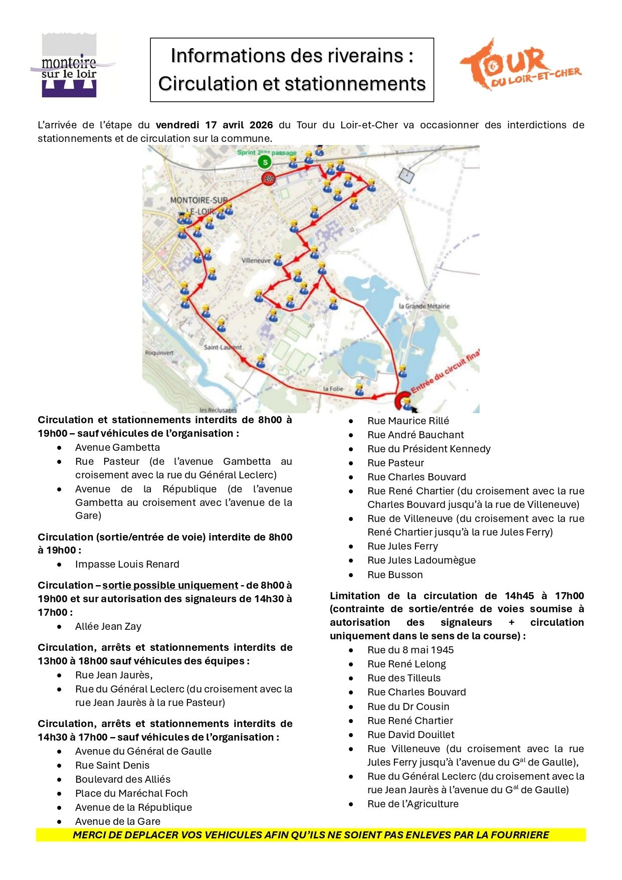 à Montoire entraînera des interdictions de stationnement et des perturbations de circulation sur la commune.