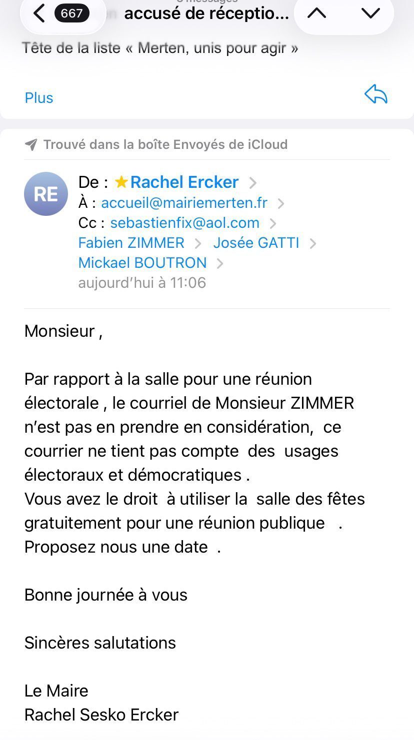 Prenant connaissance du courriel de Monsieur Zimmer , Madame le Maire a renvoyé un second courriel lui offrant à l'opposition la salle des fêtes Gratuitement !