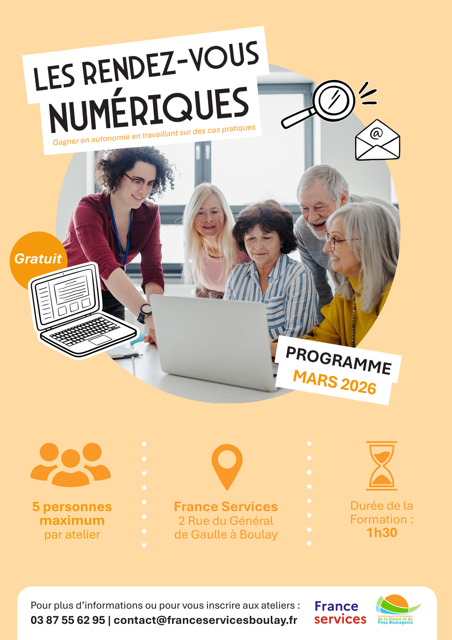 📆 Le calendrier des rendez-vous numériques dans les locaux de France Services Boulay est prêt 🛎️ pour le mois de MARS 2026.