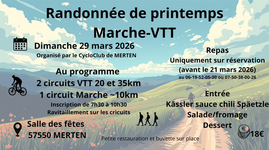 Le Cyclo Club de Merten organise le dimanche 29 mars 2026 sa traditionnelle randonnée Marche-VTT avec repas.