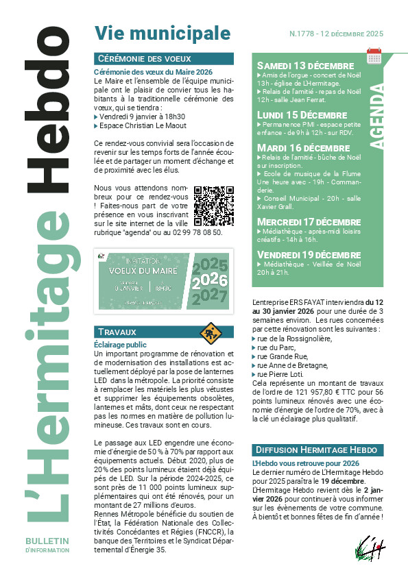 À L’Hermitage, l’entreprise ERS FAYAT interviendra du 12 au 30 janvier 2026 pour remplacer 56 points lumineux dans les rues suivantes :