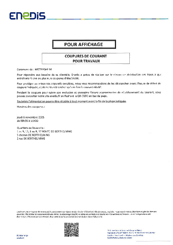 Enedis nous informe d'une coupure d'électricité programmée le 06/11/2025 sur la commune de MITTERSHEIM