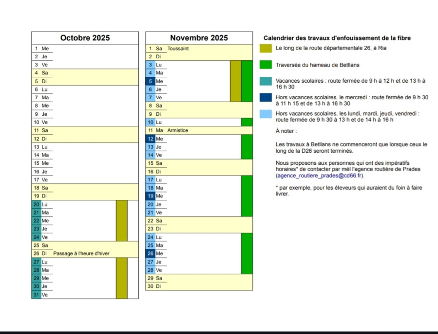 Vous trouverez ci-joint un calendrier (réalisé par la commune de Conat) qui récapitule, hors imprévus, les lieux, dates, horaires et conditions particulières d'exécution des travaux, tel que cela a été défini lors de la réunion de préparation de chantier qui s'est tenue ce vendredi 10 Octobre à Urbanya.