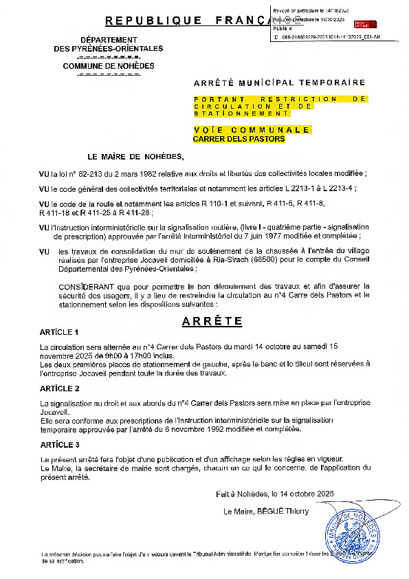 La circulation sera alternée au niveau du n°4 de la carrer dels Pastors de 9h00 à 17h00 durant la période de travaux.