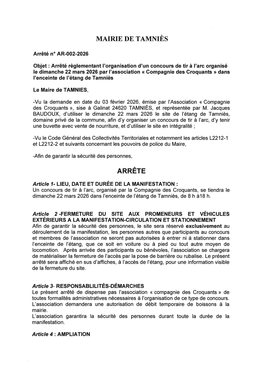 en raison d'un concours de tir à l'arc organisé par la Compagnie des Croquants dans toute l'enceinte de l'étang et pour des raison de sécurité, l'accès au site de l'étang et le parking seront interdits à toute autre personne que les membres de l'associations et les participants au concours