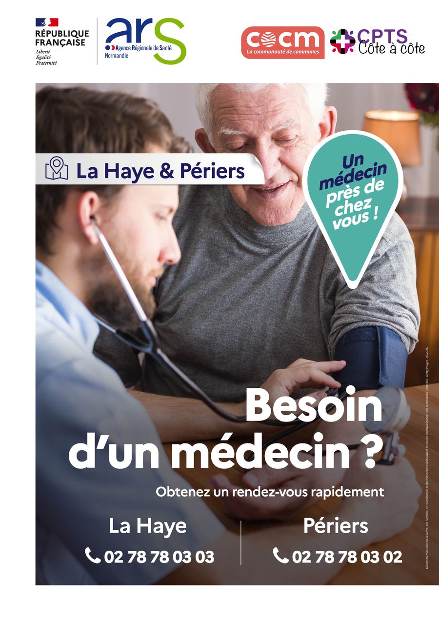 Les consultations médicales, dans le cadre du dispositif "un médecin près de chez vous" continuent en mars pour le pôle de santé de La Haye. Des nouvelles dates ont aussi été annoncées sur un nouveau pôle de santé : celui de Périers, 5 ter rue de la Halle, 50190 PÉRIERS.