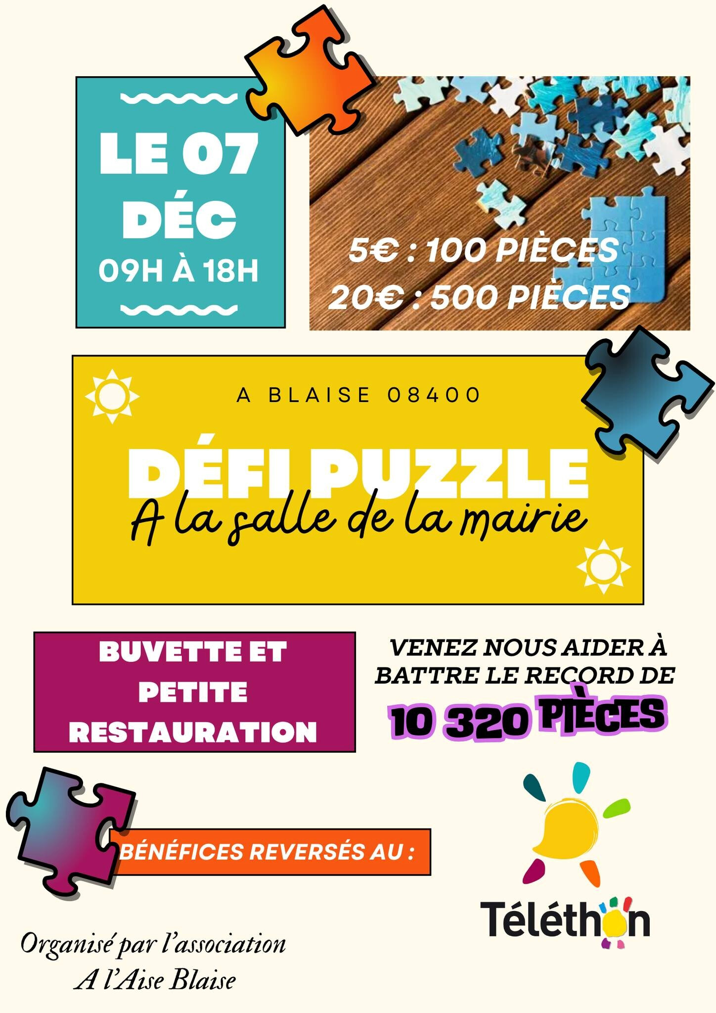 💟 Téléthon-Blaise : de 9h à 17h, Défi puzzle au profit du Téléthon, toute la journée à la salle de la mairie de Blaise (5€/100 pièces 20 €/500 pièces).