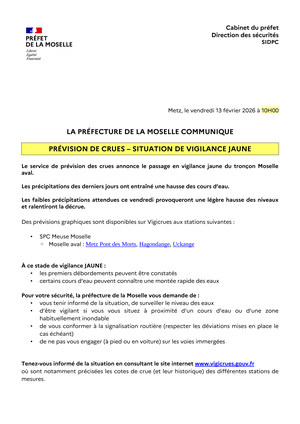 La Préfecture nous informe d'une vigilance jaune - crues sur le bassin de Moselle aval. Vous pouvez surveiller la hauteur d'eau sur le site vigicrues.