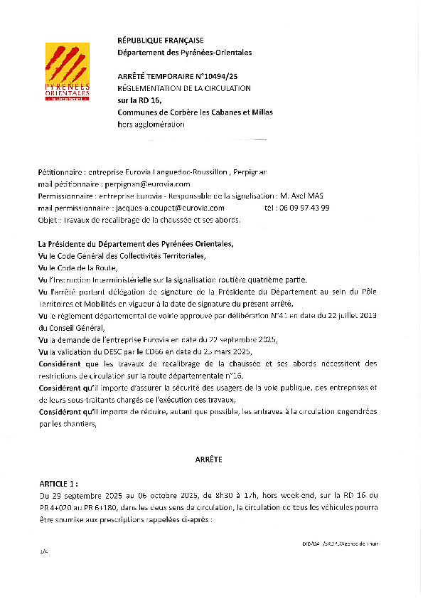 Le Conseil Départemental nous informe que la RD16 entre le giratoire de Thuir et le giratoire de St Féliu sera interdite à la circulation pour travaux entre 8h30 et 17h00, hors week-end, dans les deux sens de circulation du 29 septembre 2025 au 06 octobre 2025.