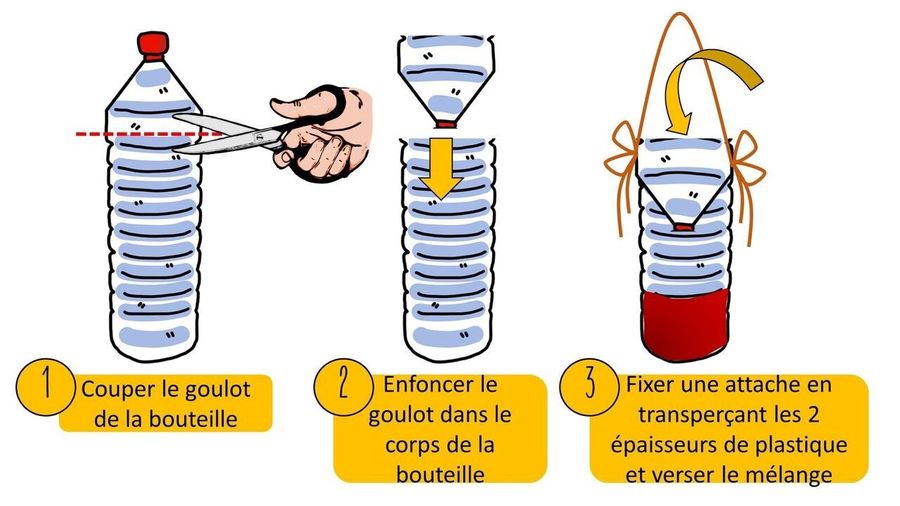 Pour cela, il s’agit de construire un piège à frelons asiatiques à partir d’une bouteille en plastique. Notons que quand le piège est plein, il faut le vider et rajouter du liquide, sans le laver car ce sont les phéromones déposées par les frelons qui attirent les autres frelons ; ces mêmes phéromones ainsi que le vin blanc éloignent également les abeilles.