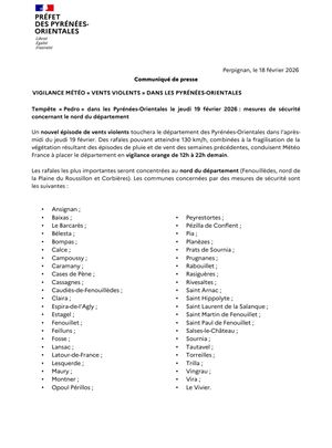 🌬️ Dès ce mercredi 11 février, le vent souffle déjà sur le département. Après une accalmie passagère, il reprendra très soudainement et très fortement dans la nuit, avec des rafales généralisées comprises entre 100 et 130 km/h. Des pointes pouvant atteindre 150 km/h sont attendues sur le quart nord-est du département, en limite de l’Aude.