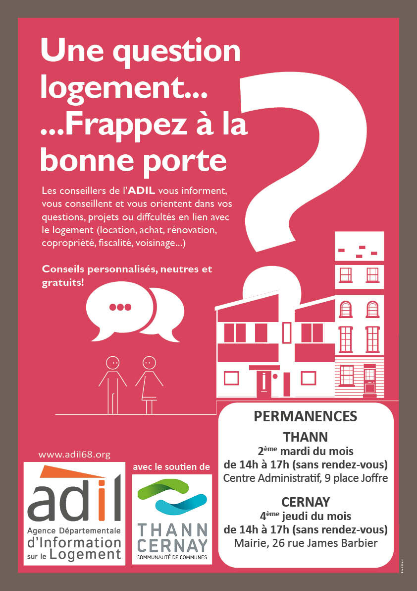 Avec le soutien de la Communauté de Communes Thann-Cernay, des permanences de l’ADIL 68 vous sont proposées à partir du mois de juin à la mairie de Cernay et au centre administratif de Thann.