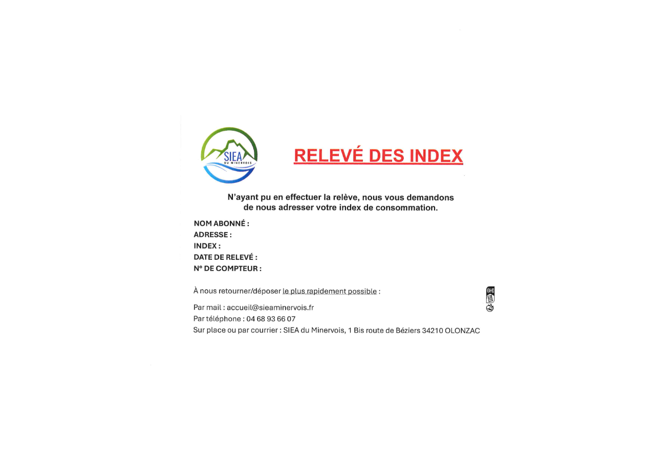 En cas d'absence, veuillez retourner l'avis de passage déposé dans votre boite aux lettres dûment complété au Syndicat de l'Eau
