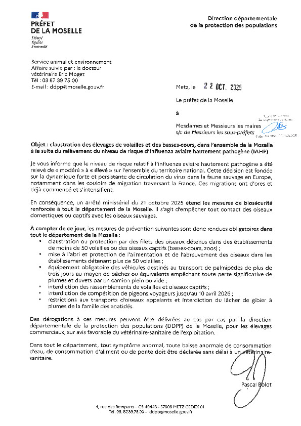 Retour de la claustration des élevages de volailles et des basses-cours dans l'ensemble de la Moselle