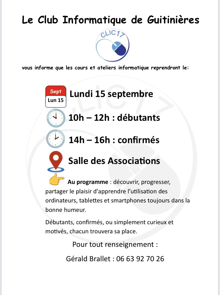 - le 1er mercredi du mois à Montendre, à la salle du centre culturel, impasse de l'hôtel de ville, à côté du cinéma et de la médiathèque