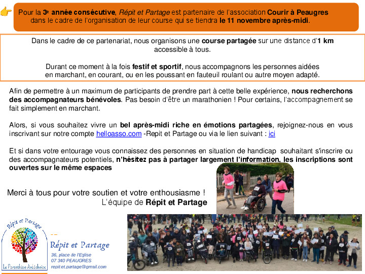 Pour la 3ᵉ année consécutive, Répit et Partage est partenaire de l’association Courir à Peaugres, dans le cadre de l’organisation de leur course qui se tiendra le 11 novembre après-midi.