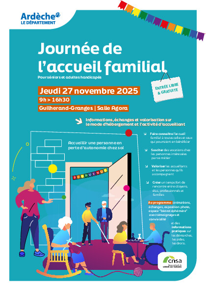 Vous trouverez en pièces jointes la version dématérialisée de l'affiche et du flyer informant de la tenue de la journée de l'accueil familial qui se tiendra le jeudi 27 novembre 2025 à la Salle AGORA à Guilherand-Granges (adresse : 222 Av. Clémenceau 07500 GUILHERAND GRANGES -entrée libre et gratuite).