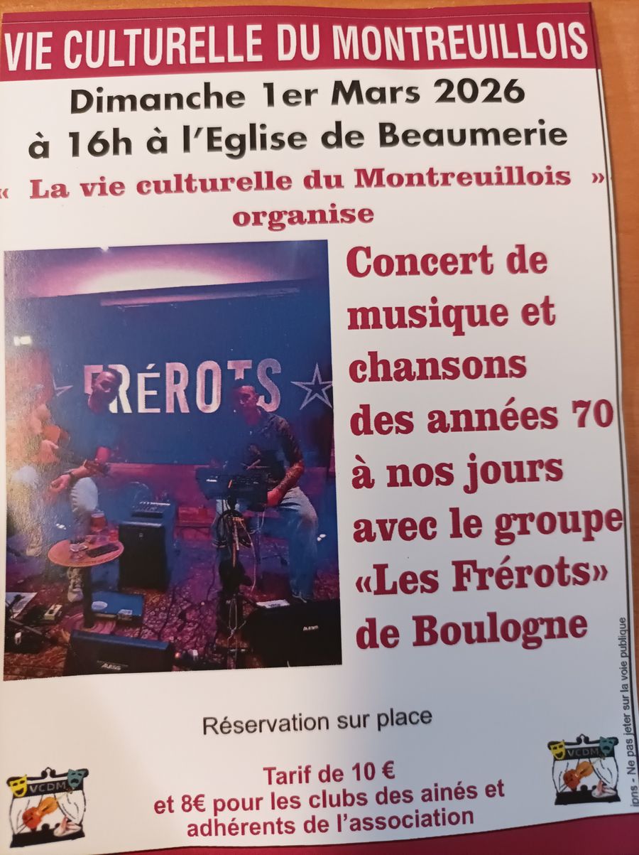 La vie culturelle du Montreuillois organise le 1er mars 2026 à 16 heures en l'église de Beaumerie Saint Martin un concert de musique et chansons des années 70 à nos jours.