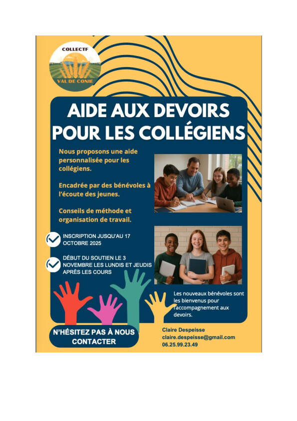 📢 Le Collectif Val de Conie propose une aide aux devoirs pour les collégiensdu territoire