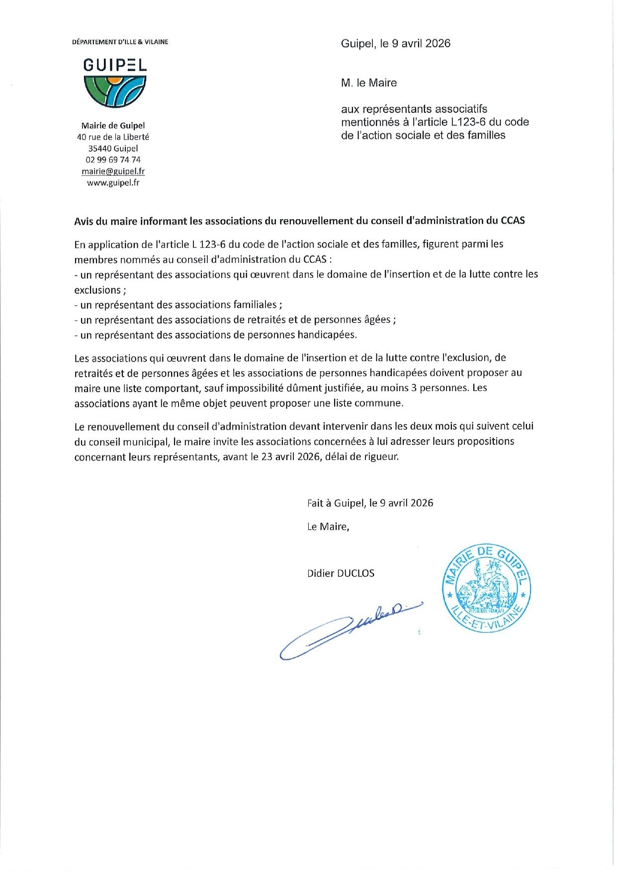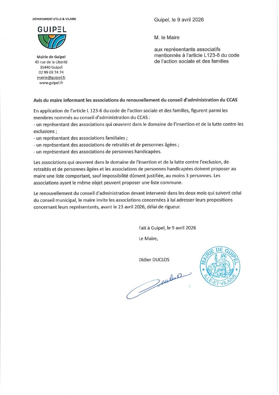 Suite aux élections municipales du 15 mars, le Conseil d'Administration du Centre Communal d'Action Sociale (CCAS) de Guipel se renouvelle !