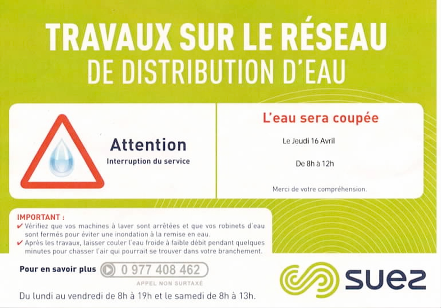 En raison de travaux sur la commune, une coupure d'eau est programmée