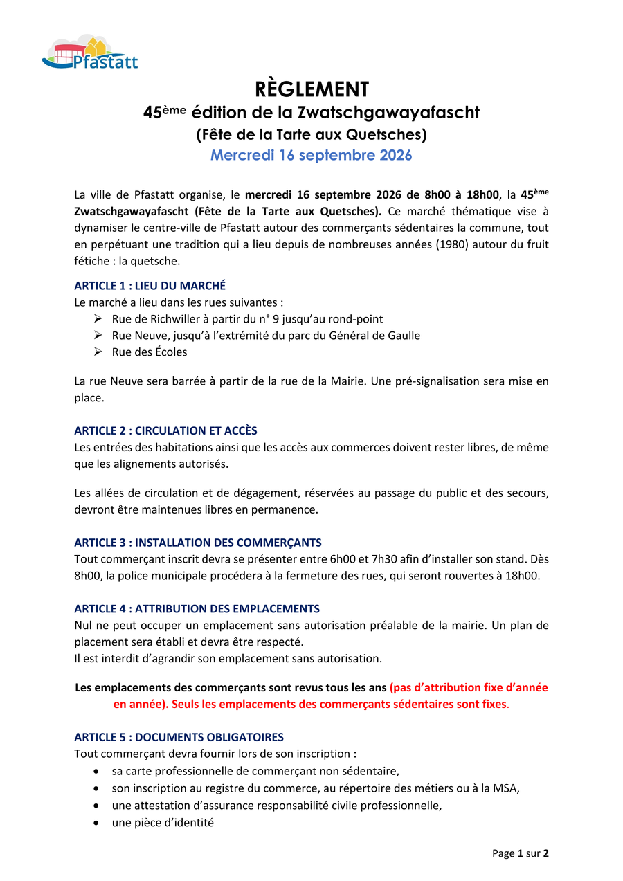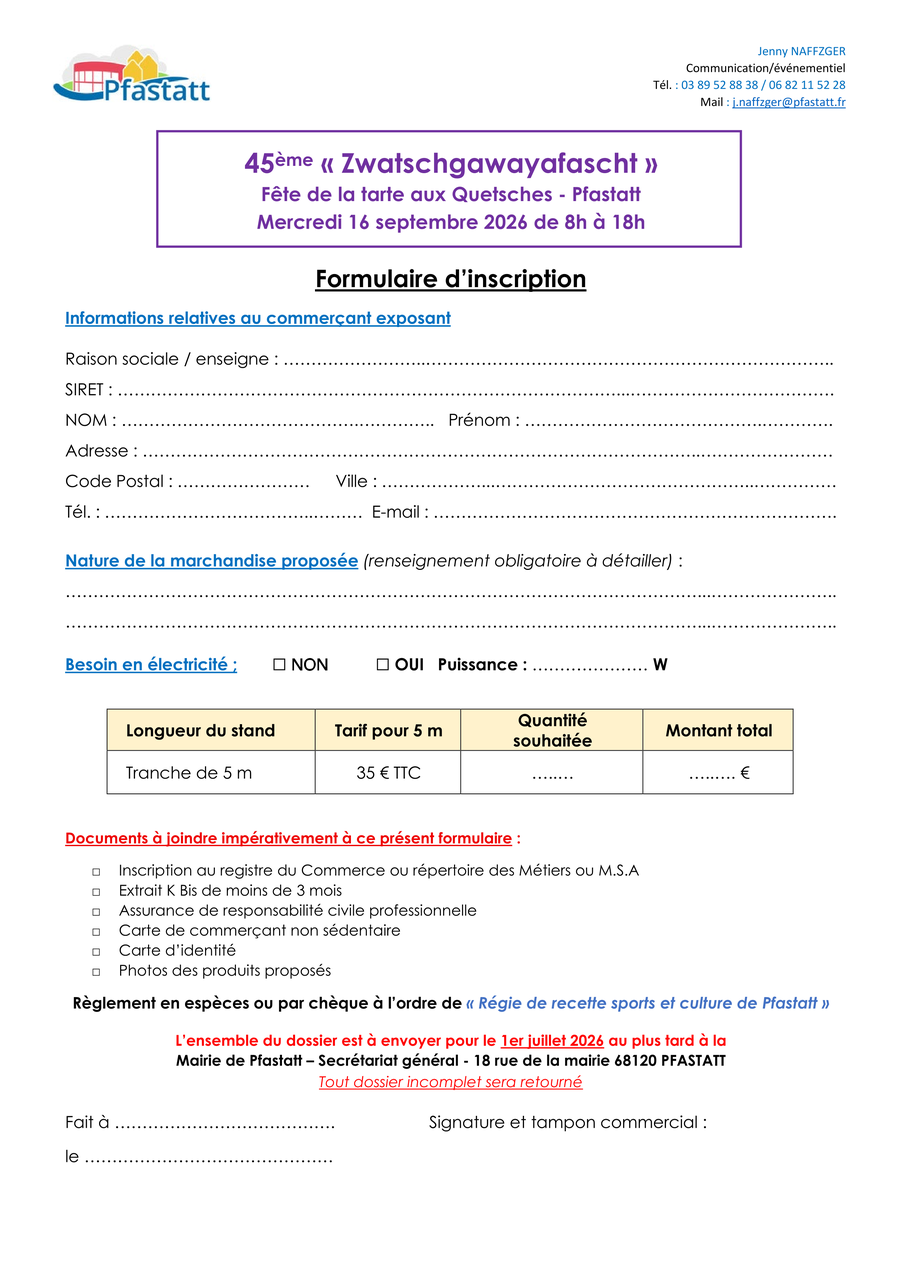 Retrouvez ci-dessous le formulaire d'inscription et le règlement à renvoyer avant le 1er juillet 2026 à la Mairie de Pfastatt - Secrétariat général, 18 rue de la Mairie, 68120 Pfastatt.