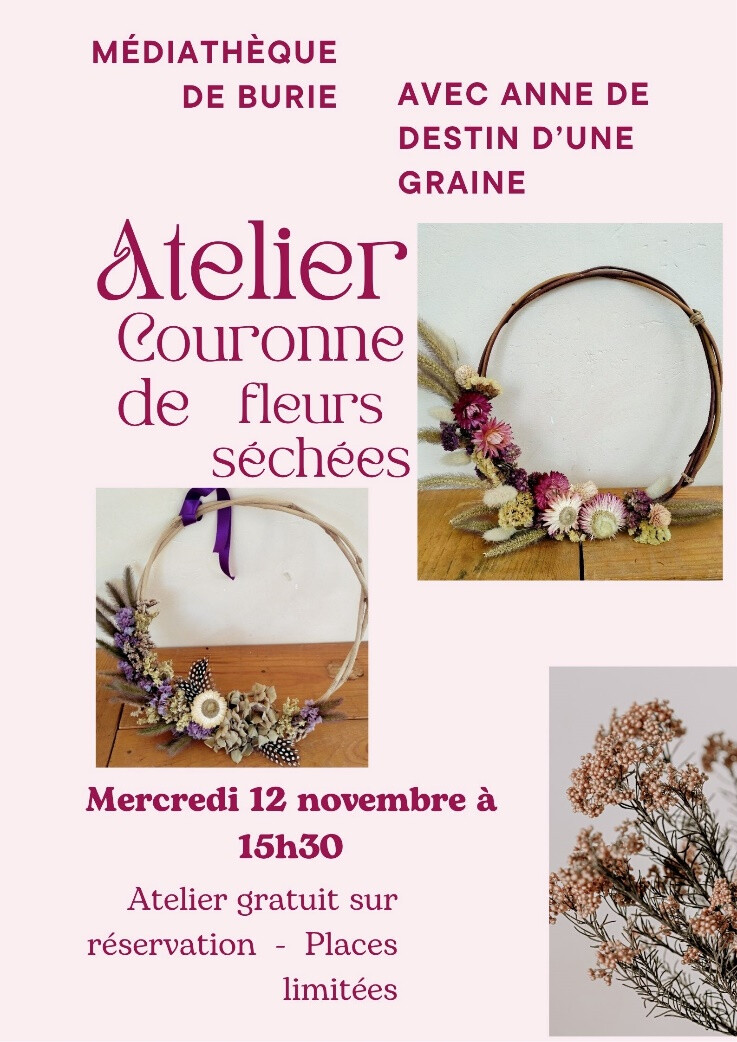 à « l'atelier Couronne de fleurs séchées » du mercredi 12 novembre à 15h30. Les places étant limitées il est recommandé de s'inscrire à l'avance. Vous pourrez réaliser, en compagnie d'Anne de Destin d'une graine, une couronne de fleurs séchées, à emmener chez vous. Cet atelier est gratuit et ouvert aux adultes, adolescents et enfants de plus de 8 ans. Une belle initiation à l'art floral ! Pour les réservations, vous pouvez téléphoner au 05.46.97.14.07, envoyer un email à mediatheque@mairie-burie.fr ou bien m'en parler sur place.