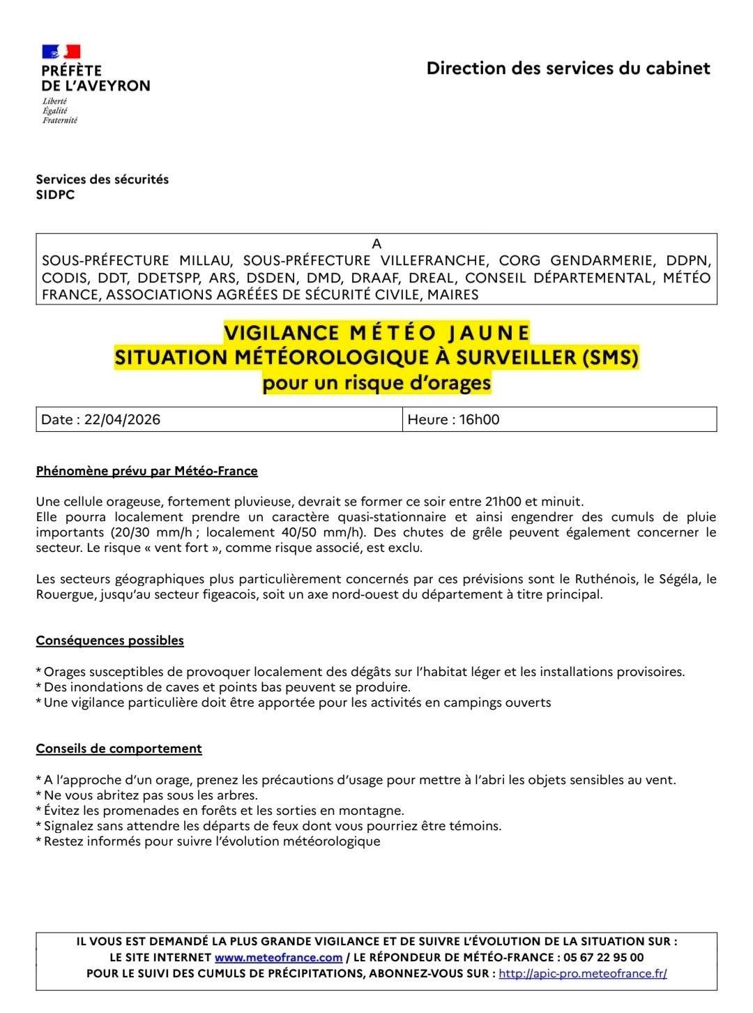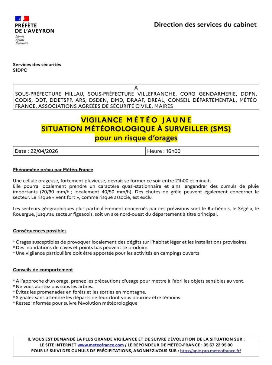 La Préfecture de l’Aveyron nous informe d’une situation météorologique à surveiller ce soir ⏰