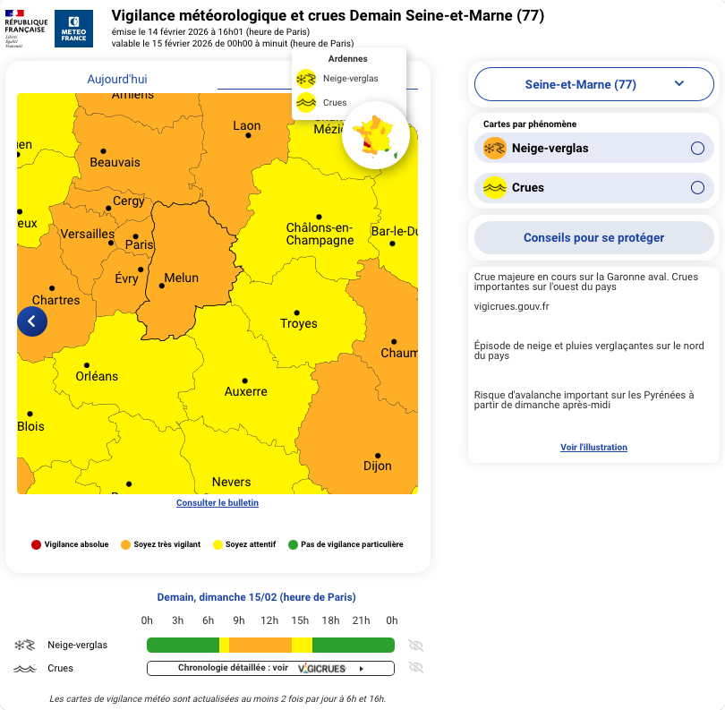 🟧 La Seine-et-Marne sera placée en vigilance Orange Neige / Verglas ce dimanche 15 février 2026 de 8h00 à 14h00 et en jaune dès 7h00.
