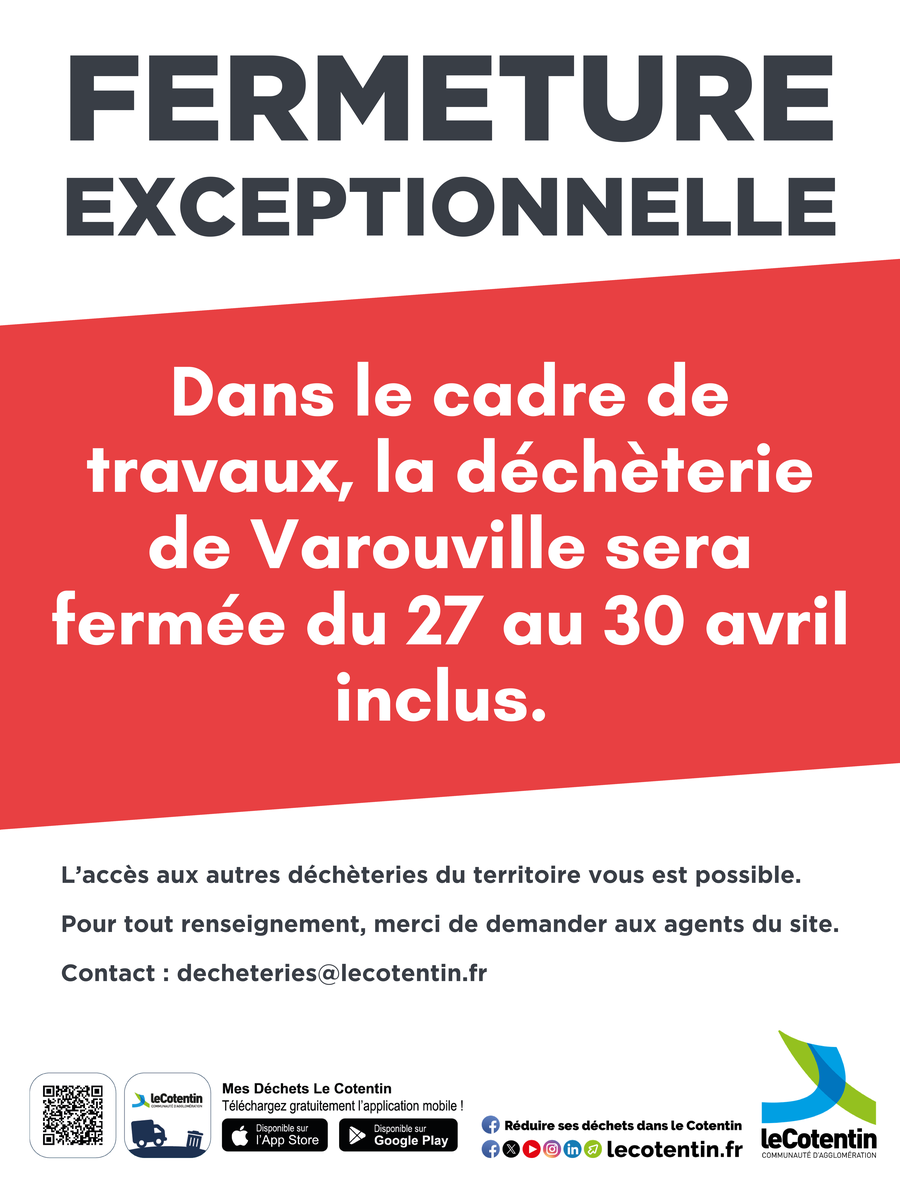 Pour votre information, en raison de travaux, la déchèterie de Varouville sera fermée du 27 au 30 avril inclus.