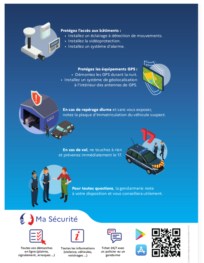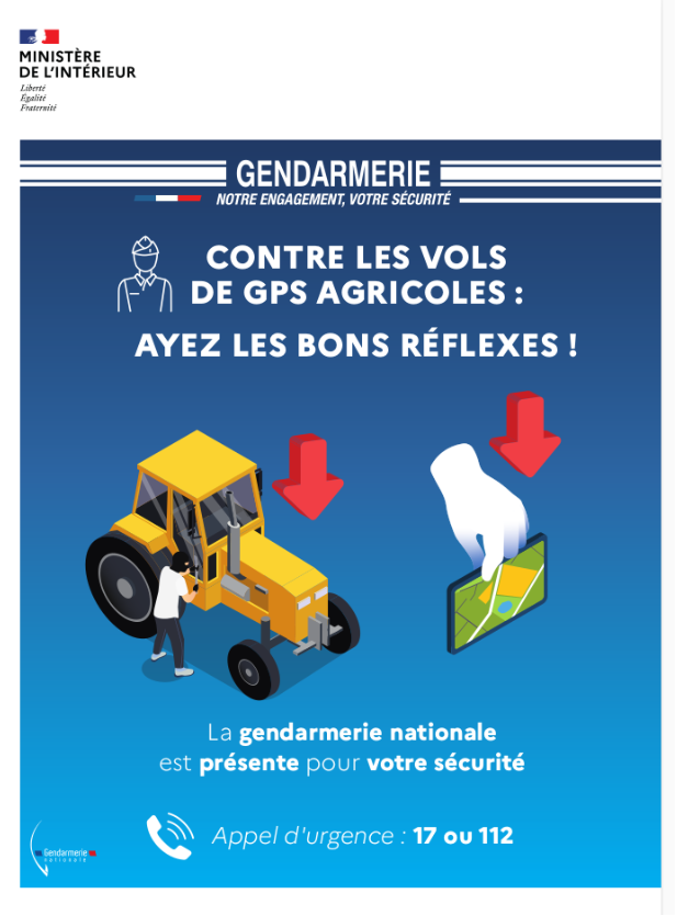 Bonjour, depuis quelques semaines le groupement de l'Orne connaßt une recrudescence de cambriolages dans les sociétés et coopératives agricoles. Les départements voisins constatent eux des vols de GPS agricoles. VIGILANCE, PRUDENCE et PRECAUTIONS.