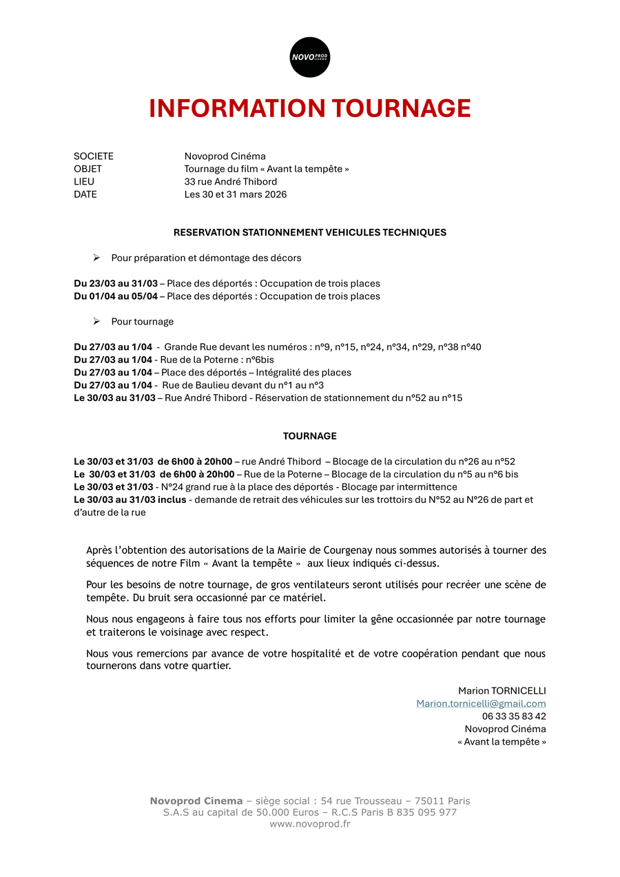 Il y a 3 sessions de tournage qui sont prévus à Courgenay :