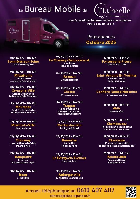 Le bureau mobile se déplace à la demande, à travers toutes les Yvelines, avec un travailleur social de l’Étincelle pour assurer des moments d’écoute, d’aide et d’orientation auprès des femmes victimes ou ayant été victimes de violences.