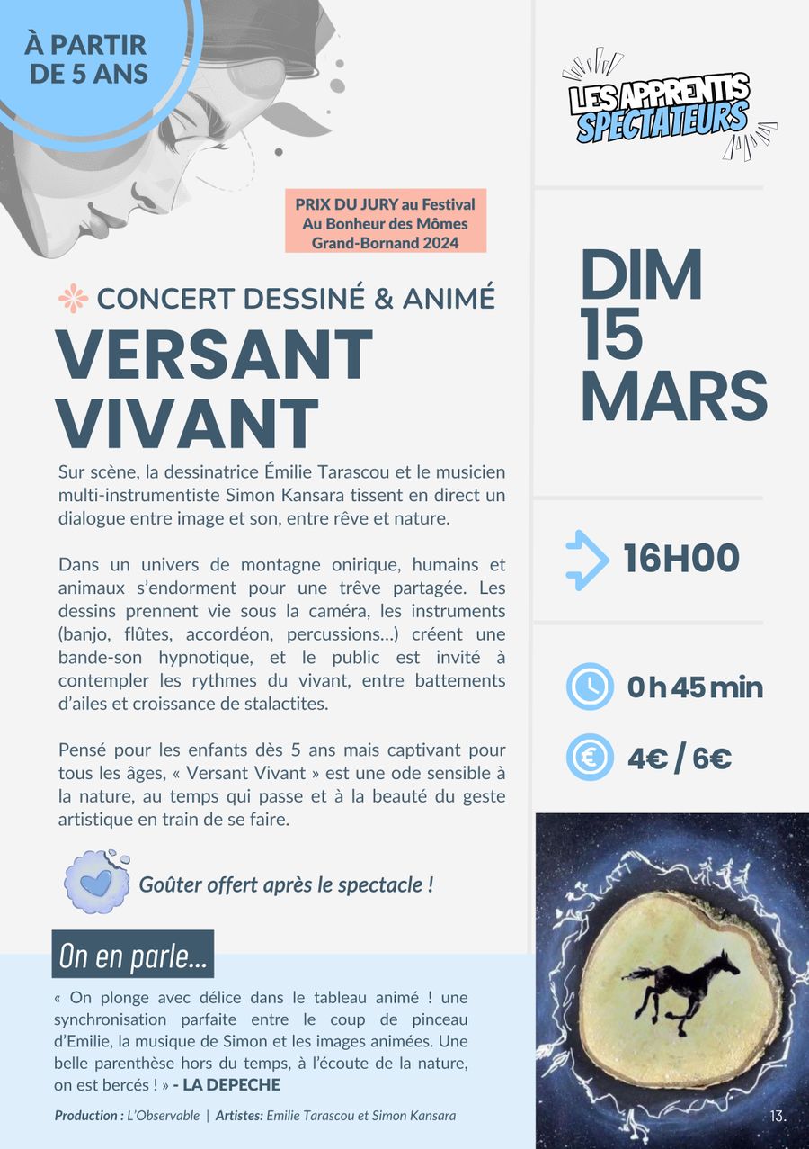 Pensé pour les enfants dès 5 ans mais captivant à tout âge, « Versant Vivant » est une ode sensible à la nature, au temps qui passe et à la beauté du geste artistique en train de se créer sous nos yeux.