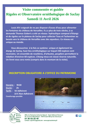 L'Office du Patrimoine de Saint-Rémy-lès-Chevreuse vous propose une visite commentées et guidées de la Pagode de Villebon-sur-Yvette le samedi 21 Mars à 11h ainsi que l'Observatoire Ornithologique et les rigoles de Saclay le samedi 11 Avril à 9h30.