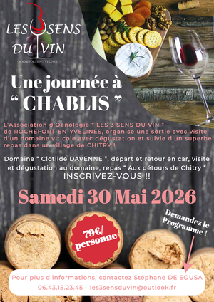 Comme l'année dernière, voilà que l'Association LES 3 SENS DU VIN remet le couvert avec une sortie mais pas en TOURAINE cette fois-ci, mais à CHABLIS !!! le 30 Mai 2026 !
