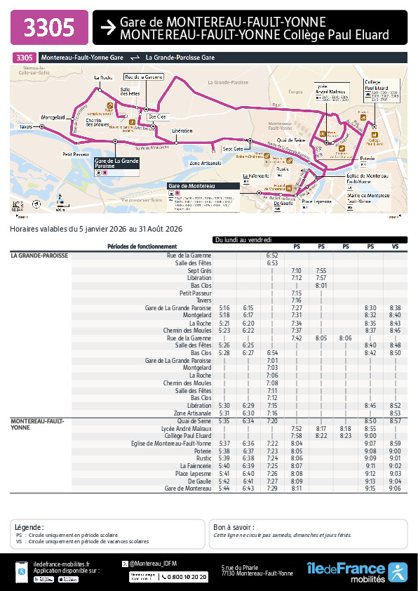Dès 23h, le trafic est interrompu tous les soirs entre Paris Gare de Lyon et Montereau. Dernier départ de Paris Gare de Lyon à destination de Montereau à 22h46, ensuite desserte assurée par des bus de substitution.