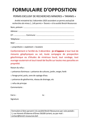 ⛔️ Si vous souhaitez manifester votre refus à toute recherche sur les parcelles dont vous êtes propriétaires, vous trouverez ci-dessous et en mairie un formulaire d'opposition à faire parvenir à la société Breizh Ressources.