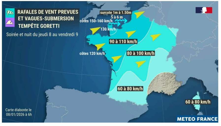 Dès la soirée de ce jeudi, les rafales de secteur sud à sud-ouest gagnent rapidement en intensité à l'approche de la tempête "GORETTI" qui circule en Manche. Les plus fortes rafales concernent d'abord l'Oise et la Somme en milieu de nuit et se généralisent rapidement à l'ensemble de la région en seconde partie de nuit, avant de faiblir progressivement vendredi.