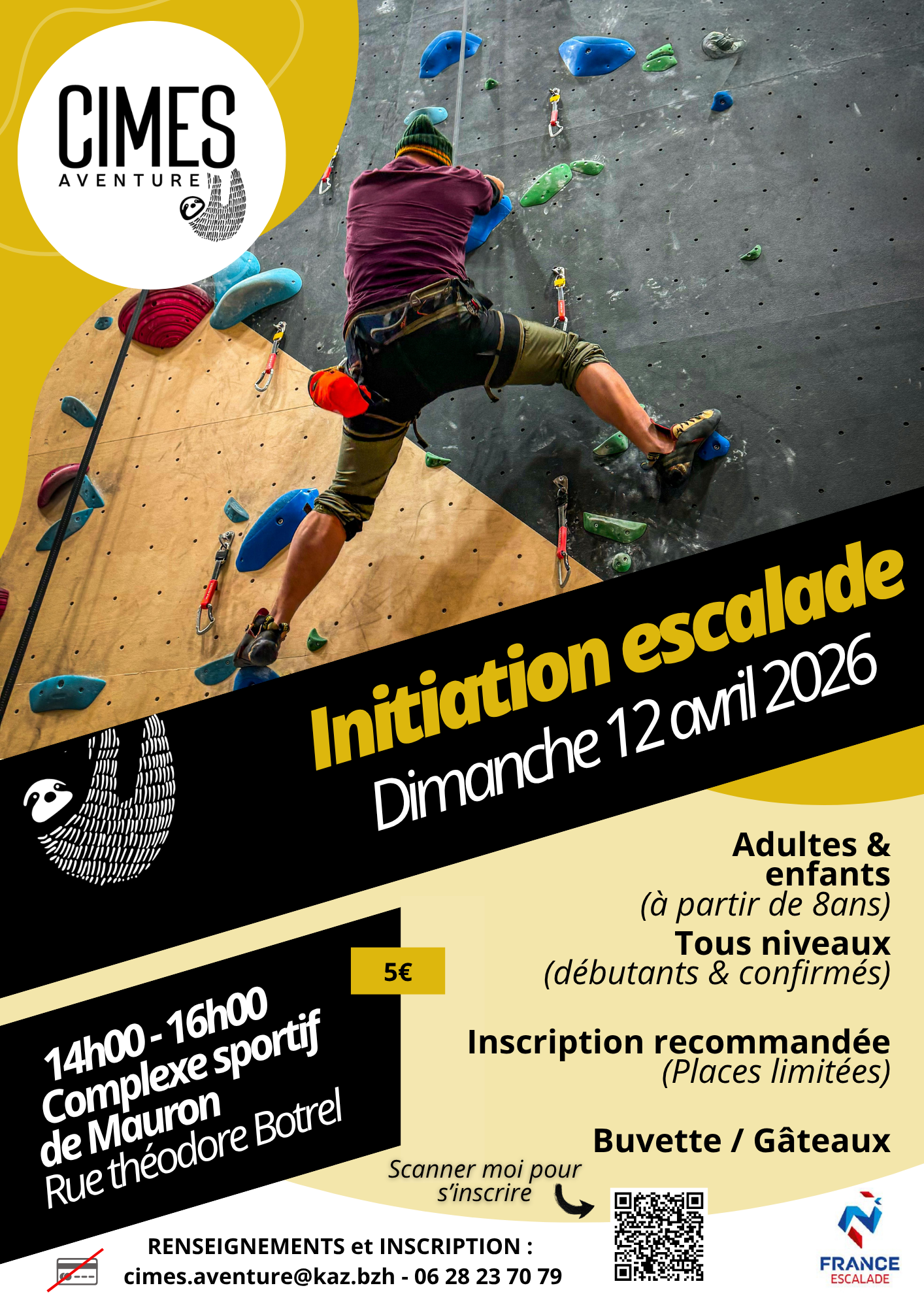La prochaine initiation escalade, le dimanche 12 avril 2026, au complexe sportif de Mauron (rue Théodore Botrel).