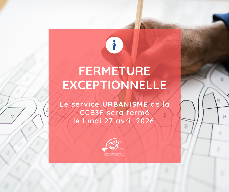 En raison de la formation des agents, le service urbanisme de la CCB3F sera exceptionnellement fermé le lundi 27 avril 2026.