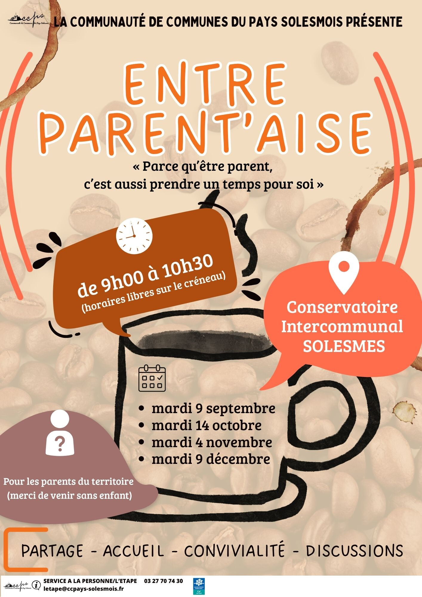 Un rendez-vous mensuel rien que pour les parents et futurs parents. Venez partager un moment chaleureux et sans jugement, échanger vos expériences, trouver des conseils, ou tout simplement discuter autour d’un café.