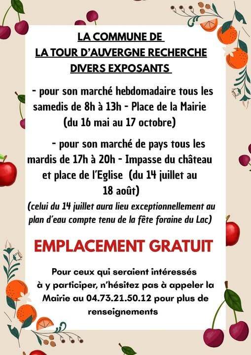 La commune de La Tour d'Auvergne recherche des exposants pour ses marchés hebdomadaires des samedis et mardis du 16 mai au 17 octobre. Emplacements gratuits.