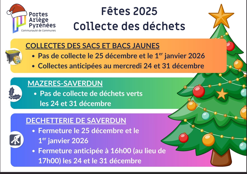 – Déchetterie de Saverdun ouverte les 24 et 31 décembre (horaires aménagés), fermée les 25 décembre et 1er janvier