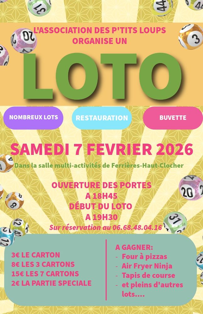 L'association des P'tits Loups organise un Loto le 7 Février 2026 à la salle multi-activités de Ferrières.