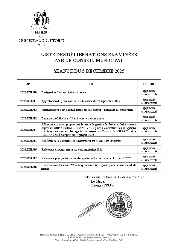 En cas d’urgence, contacter le Maire ou les Adjoints.