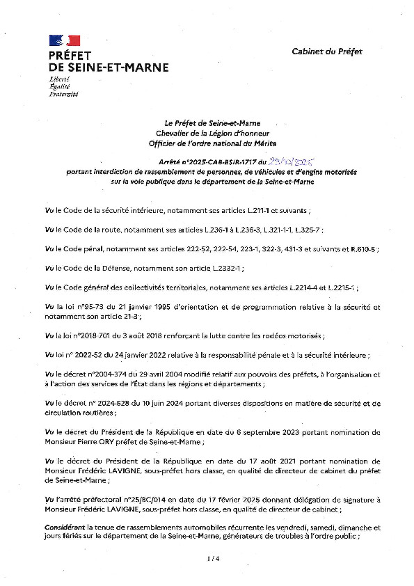 Arrêté n°2025-CAB-BSIR-1709 du 29/10/2025 portant interdiction temporaire de rassemblements festifs non déclarés à caractère musical (teknival, rave-party) et interdiction de circulation de tout véhicule transportant du matériel de sons à destination d’un rassemblement festif à caractère musical non autorisé sur le département de Seine-et-Marne du vendredi 07 novembre 2025 à 17h00 au lundi 05 janvier 2026 à 08h00.